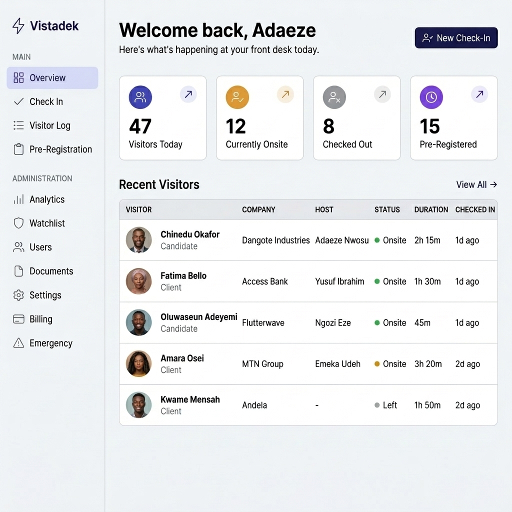 Ditch the paper logbooks and overpriced hardware. Vistadek turns any browser into a secure, intelligent visitor management system, live in under 5 minutes.